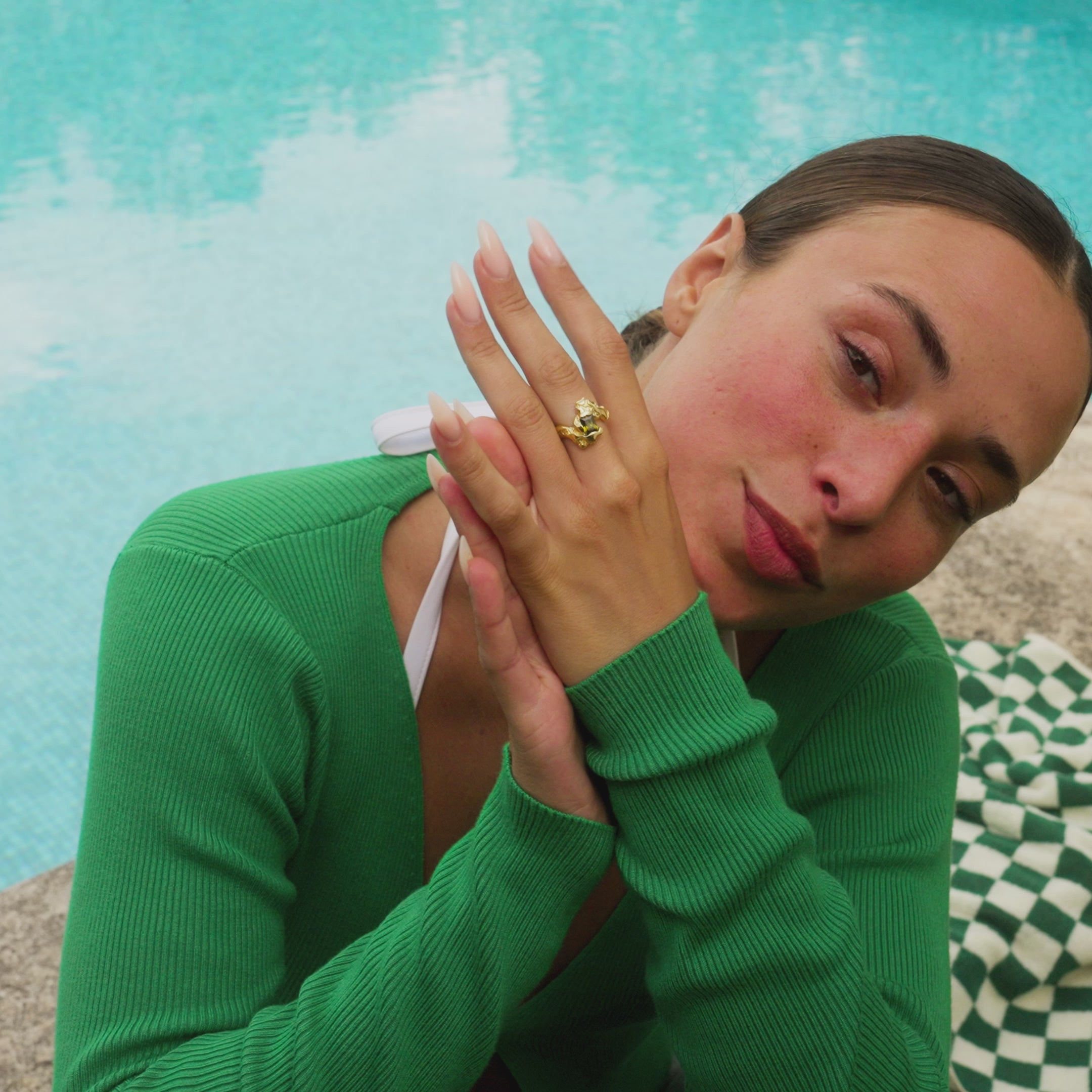 Big Contrast Ring er som skabt til dem, der vil skille sig ud med subtil elegance. Lad den smukke olivengrønne sten være det, der lyser op i dit outfit og fang andres øjne, hver gang du tager den på. Den er perfekt til at bære alene for et mere simpelt look, eller som en del af et stack for det ultimative statement.