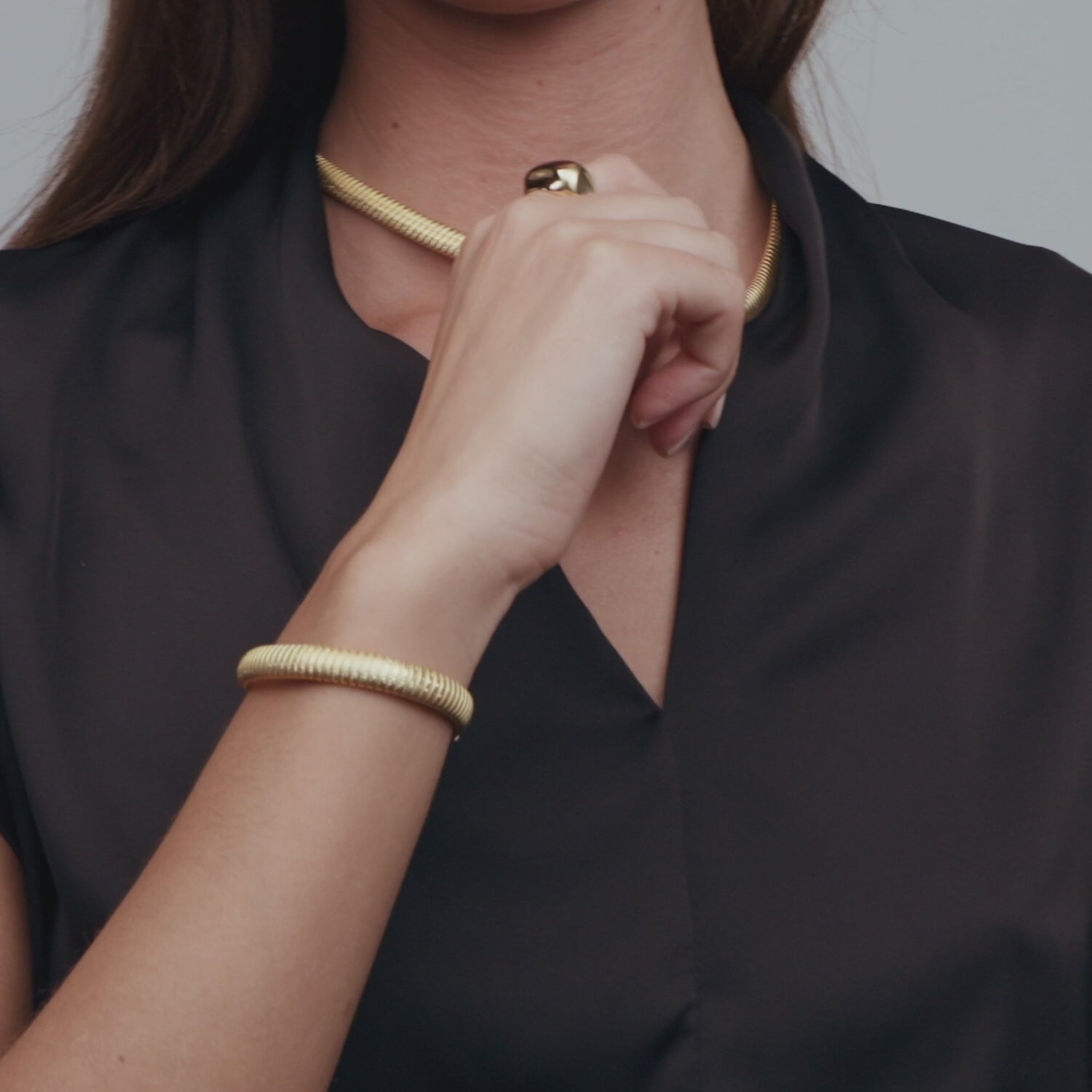 Riva armbåndet i forgyldt sterlingsølv er et afsindig smukt statement-armbånd, hvor den karakteristiske Riva-struktur giver et luksuriøst og moderne udtryk. Den varme, gyldne tone fremhæver de fine detaljer i designet og skaber et smykke, der fanger lyset elegant.